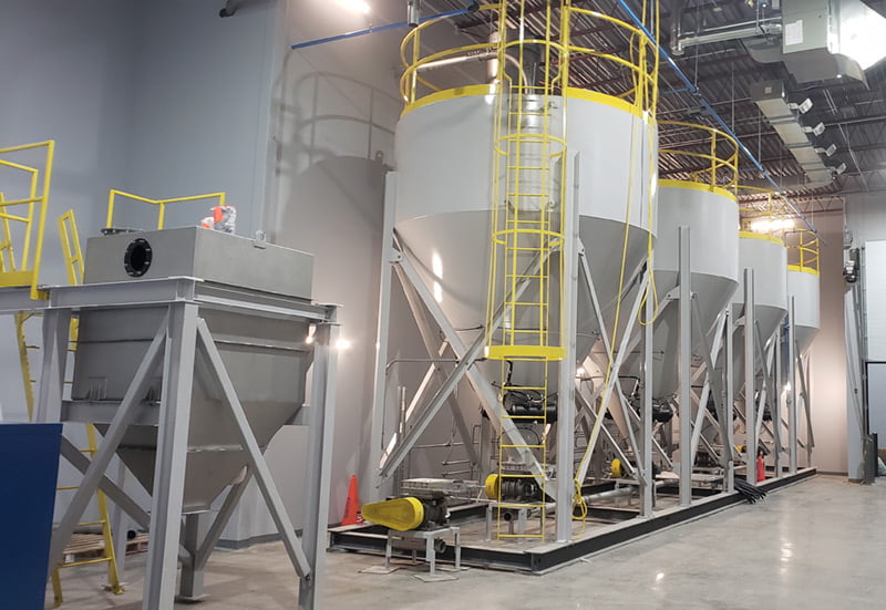 Équipements : Station de vidange de super sacs, système de transfert pneumatique, silo d'entreposage, réservoir
