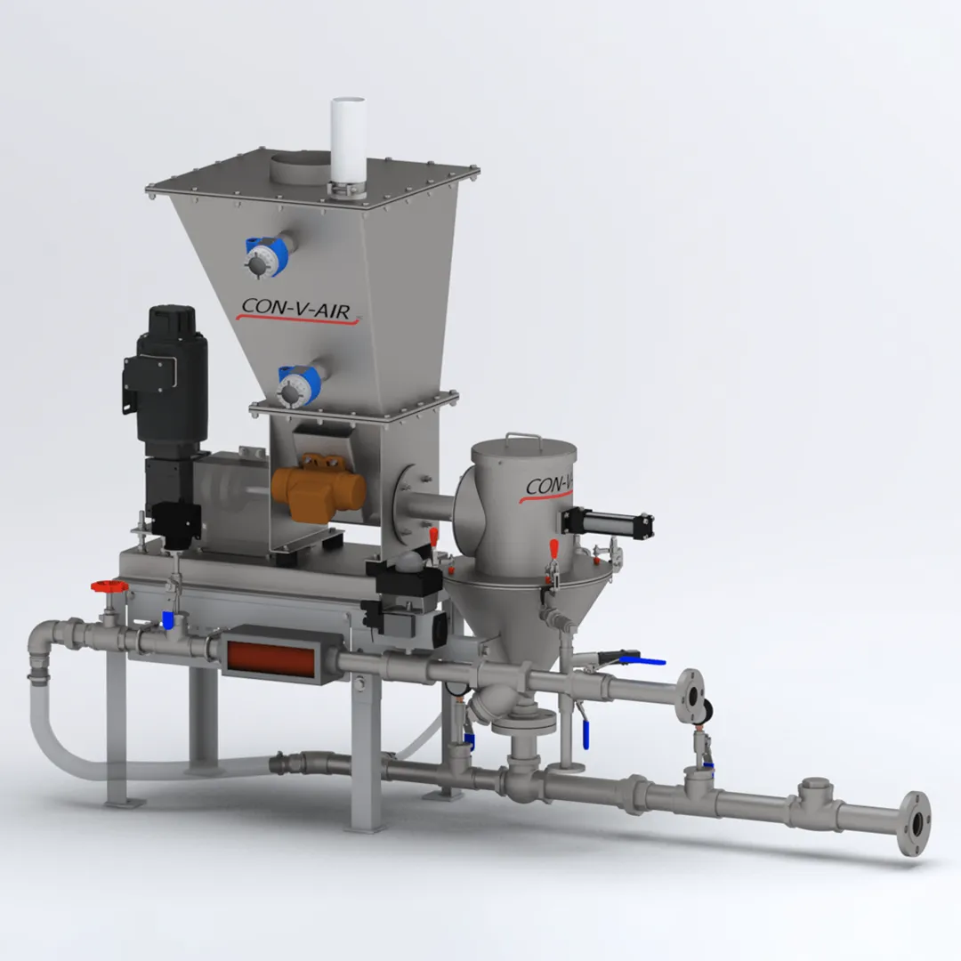 Le système d’injection directe de CON-V-AIR sert à effectuer du dosage de produits chimiques à partir de vrac solide de manière continue, à même les points d’application et ce, sans nécessiter de bassin de mélange. On retrouve généralement ce système dans le secteur du traitement des eaux et les produits qui sont typiquement utilisés sont le charbon activé en poudre (CAP/PAC), l’oxyde de magnésium (MgO), carbonate de sodium (Soda Ash), polymère sec et plusieurs autres.